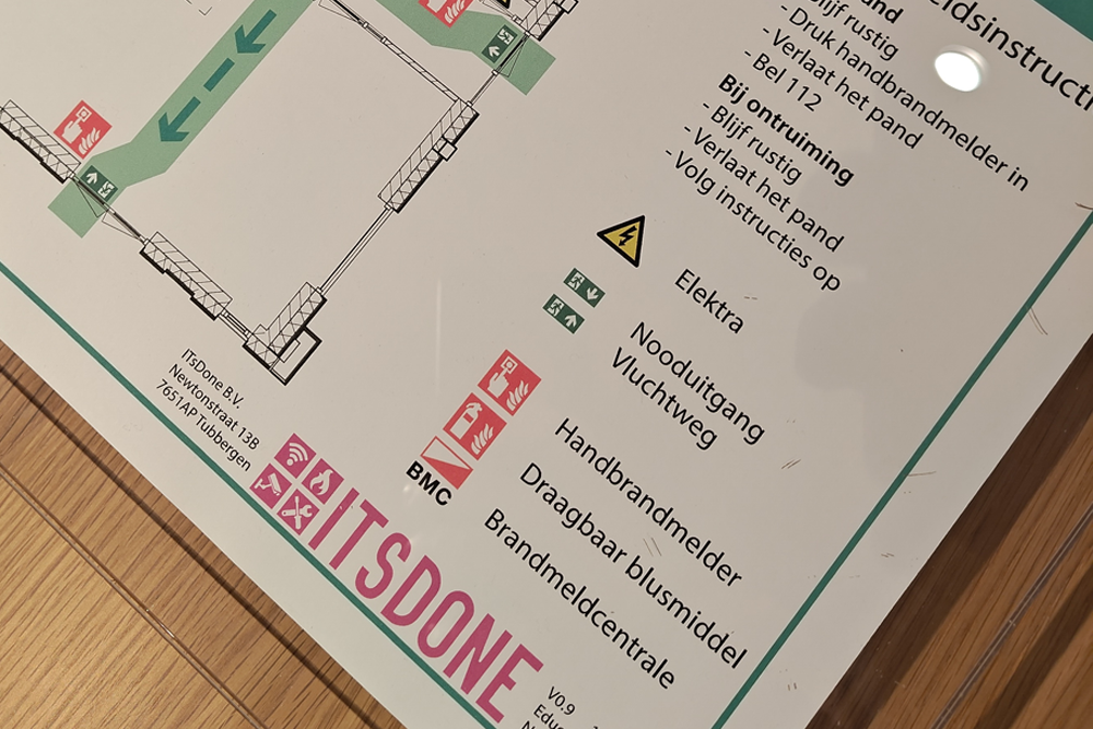 Een goed ontworpen ontruimingsplattegrond kan levens redden. Bij ITsDone zorgen wij ervoor dat uw medewerkers, bezoekers en hulpdiensten in een noodsituatie precies weten wat ze moeten doen en waar ze heen moeten. Onze ontruimingsplattegronden voldoen aan de NEN 1414-norm en zijn helder, professioneel en afgestemd op uw gebouw en gebruikssituatie.